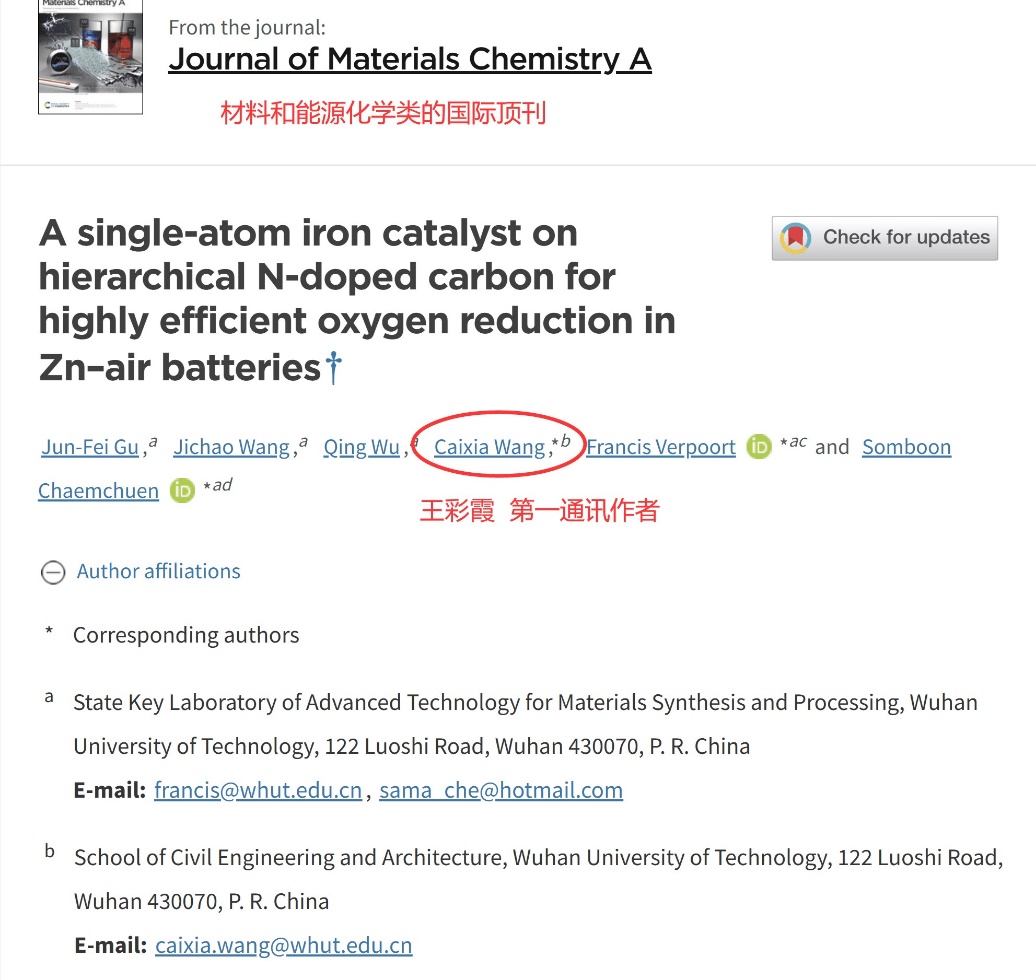 《Journal of Materials Chemistry A》是英国皇家化学会(Royal Society of Chemistry,简称RSC)下的一本旗舰期刊,是材料化学领域的权威期刊,专注于报道材料在能源和可持续性方面应用,以其严格的审稿标准和高质量的学术要求而闻名,影响因子为10.7。王彩霞老师的论文能够在此期刊上发表,不仅是对其研究成果的肯定,也是对成人影视片 科研水平的国际认可。