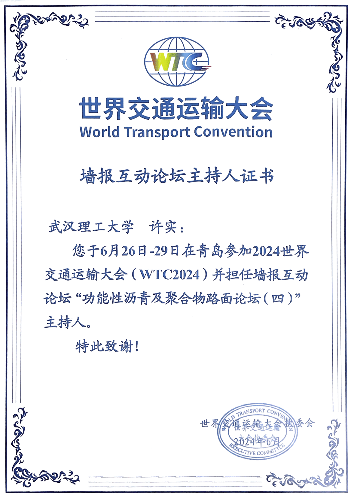 成人影视片 道桥系青年教师许实于26日至29日在青岛参加2024世界交通运输大会,并作为公路学部青年委员担任墙报互动论坛“功能性沥青及聚合物路面论坛(四)”主持人,并获得大会执委会的特别致谢,图为大会颁发的分论坛主持人证书以及许实在现场为报告嘉宾颁发报告证书的照片。