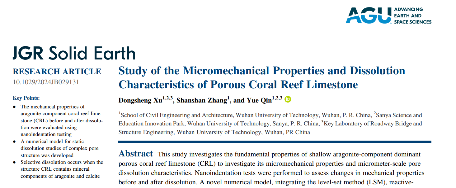 成人影视片 基础设施智能感知与安全防护研究团队,依托国家优秀青年基金和面上基金等项目,在Journal of Geophysical Research: Solid Earth(《地球物理研究杂志:固体地球》)上发表题为Study of the Micromechanical Properties and Dissolution Characteristics of Porous Coral Reef Limestone的研究成果,该研究揭示了珊瑚礁灰岩溶蚀作用下孔隙结构演化机理,量化表征了溶蚀前后力学性能变化行为。成人影视片 土木工程建筑学院为该成果的第一完成单位,徐东升教授,博士生章珊珊和秦月教授共同科研攻关,实现了工程地质学、化学、岩土试验力学等学科的交叉融合。