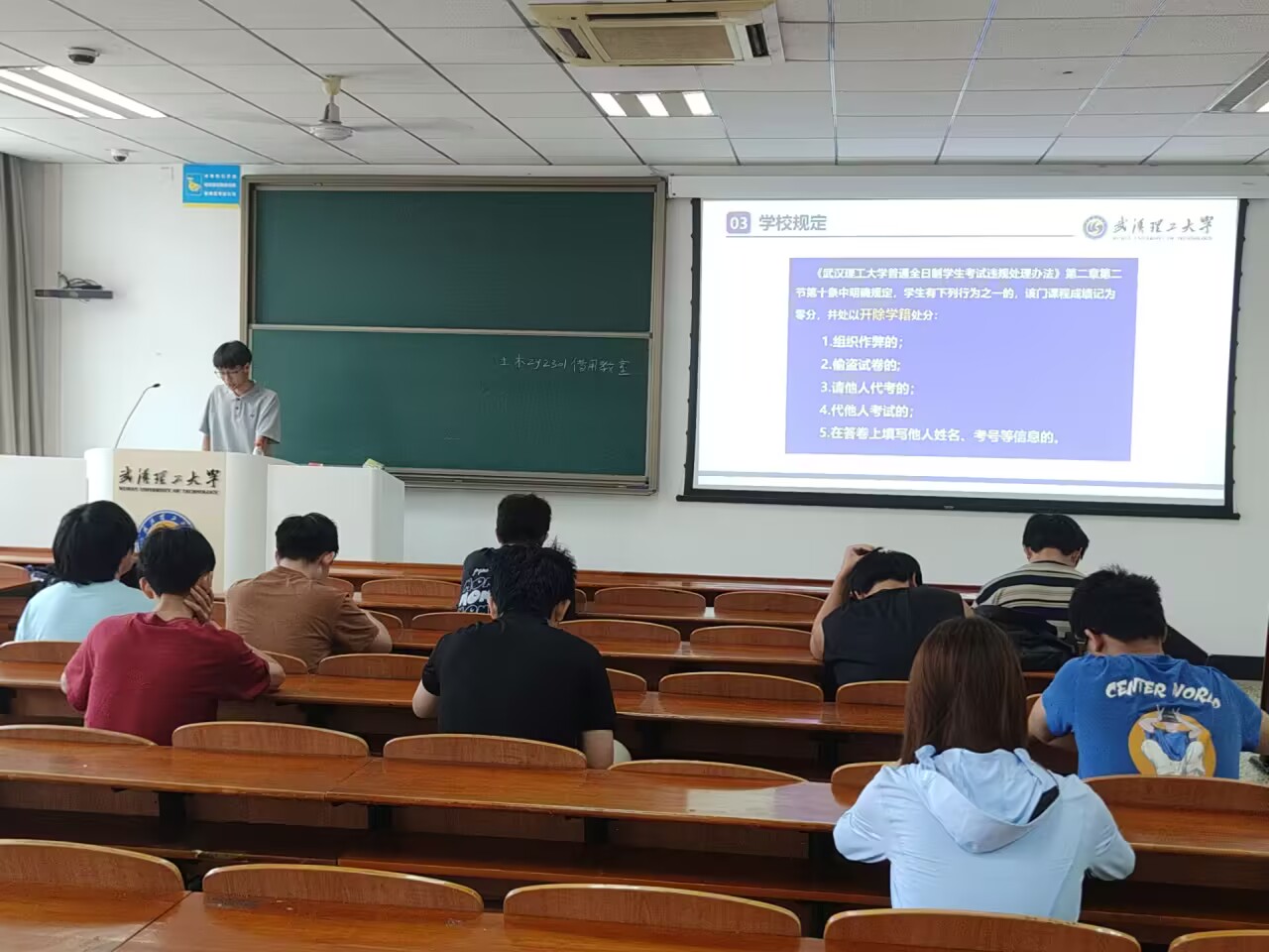 会议伊始,余谦班长对本次主题班会的意义做了简要介绍,并强调了良好的考风考纪对于学术诚信的重要性。他指出,考试不仅是检验学习成果的方式,也是展现个人品德和责任心的时刻。作为学生,应该以诚信为本,做到诚实守信,自觉抵制代考替考等考试违纪违法行为,考出真实水平,考出真才实学,考出诚信风格。