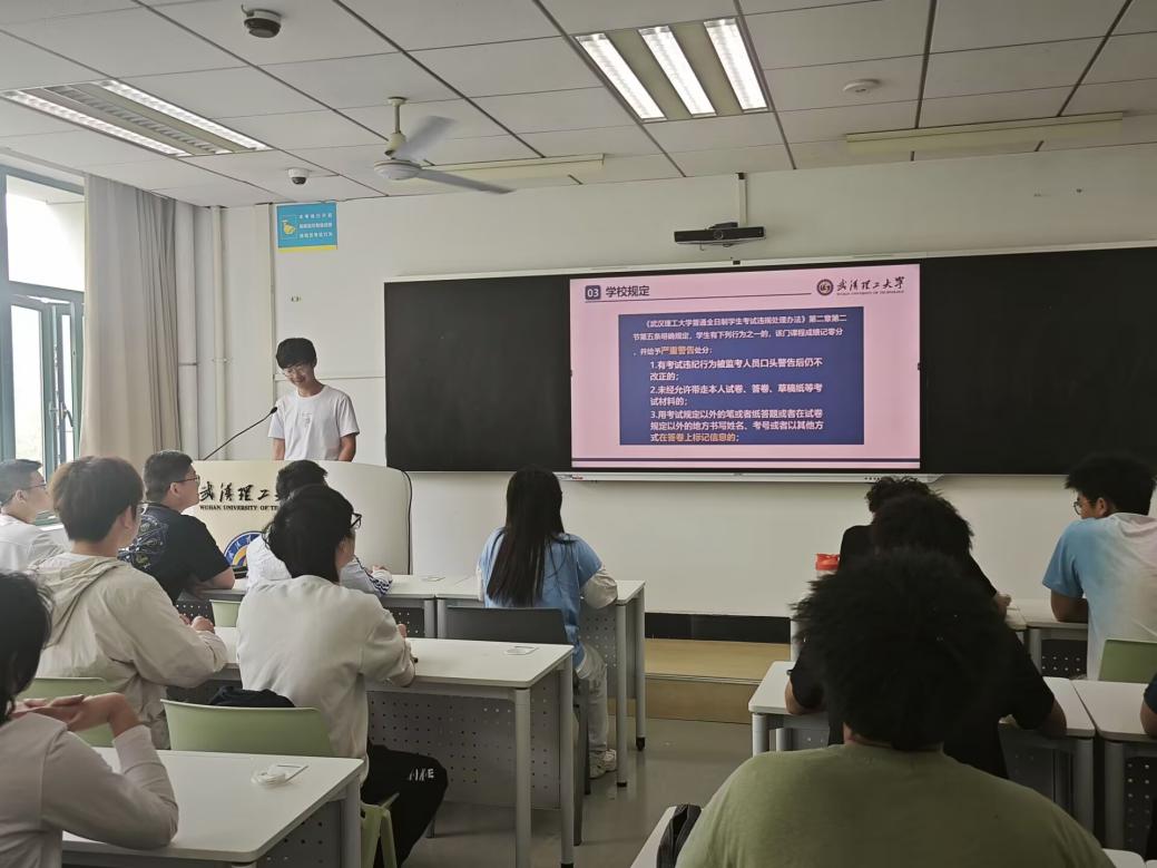 班会上,王子旭首先带领同学们学习了《学生手册》中关于考试违纪处理的相关规定,通过分析近年来高校考试违纪典型案例,重点解读了代考替考、携带通讯设备等违纪行为的严重后果。他强调:“诚信不仅是一种品德,更是一份责任,希望同学们自觉遵守考试纪律,用真才实学检验学习成果。”随后,学习委员通报了近期课堂考勤情况,对迟到、上课玩手机等不良现象提出整改要求。