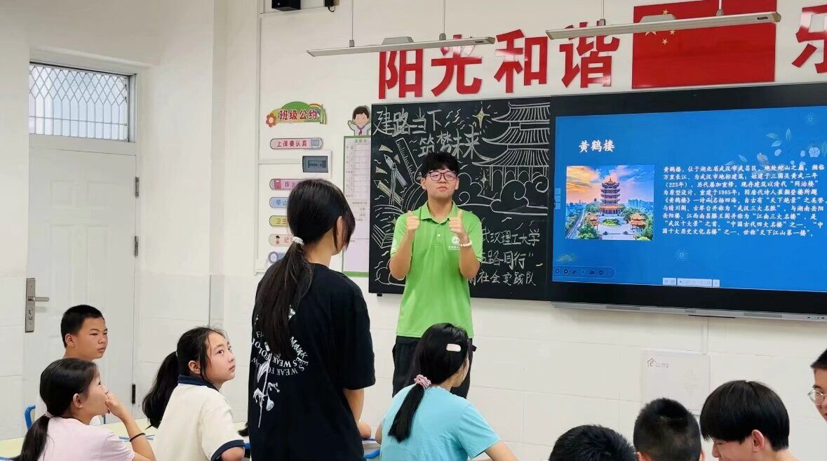 “这个是长城!那个名字叫故宫!”实践队员准备的经典古建筑图片显示出的瞬间,课堂中的学生们便积极抢答起来。接下来,实践队员们通过分享孟姜女哭长城的传说、介绍万里长城的价值意义、让同学们举例和黄鹤楼有关的诗词等多种形式,向学生们具体介绍了中国经典古建筑之中的长城、故宫和黄鹤楼。实践队员一边讲解,一边引导孩子们仔细观察屏幕上的图片,鼓励他们发现更多中国古建筑的细节之美。