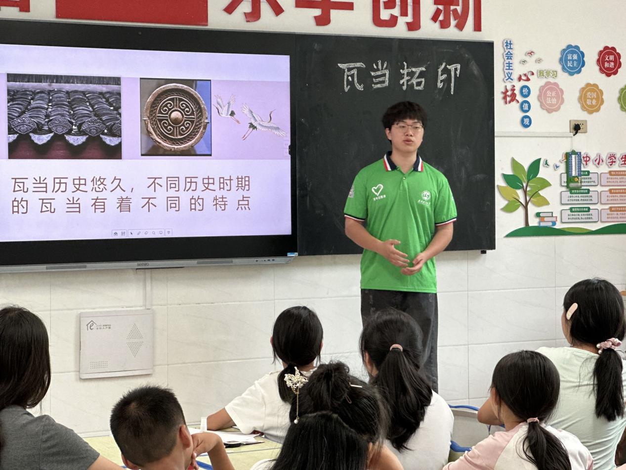 在“经典瓦当图案”的展示环节,实践队员通过精准、细致、规范的示范,向孩子们展示了瓦当精美的图案、独特的造型并解释了其中蕴含的深刻寓意。在讲解“瓦当拓印的方法步骤”时,他们将看似复杂的流程分解为一个个清晰易懂、易于操作的具体环节,确保孩子们能够准确理解和掌握,顺利进行拓印操作。