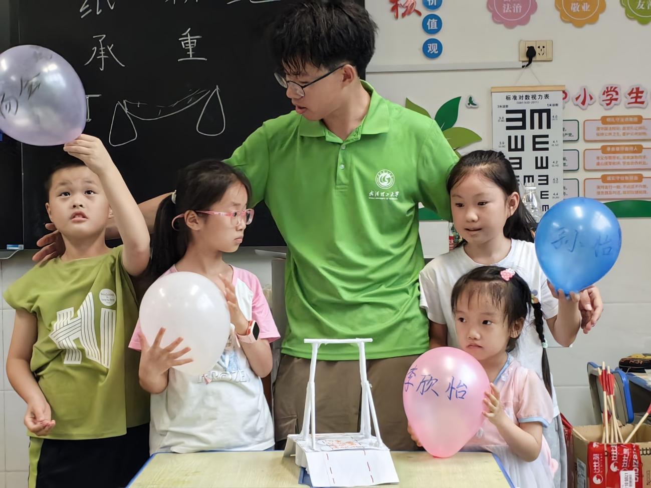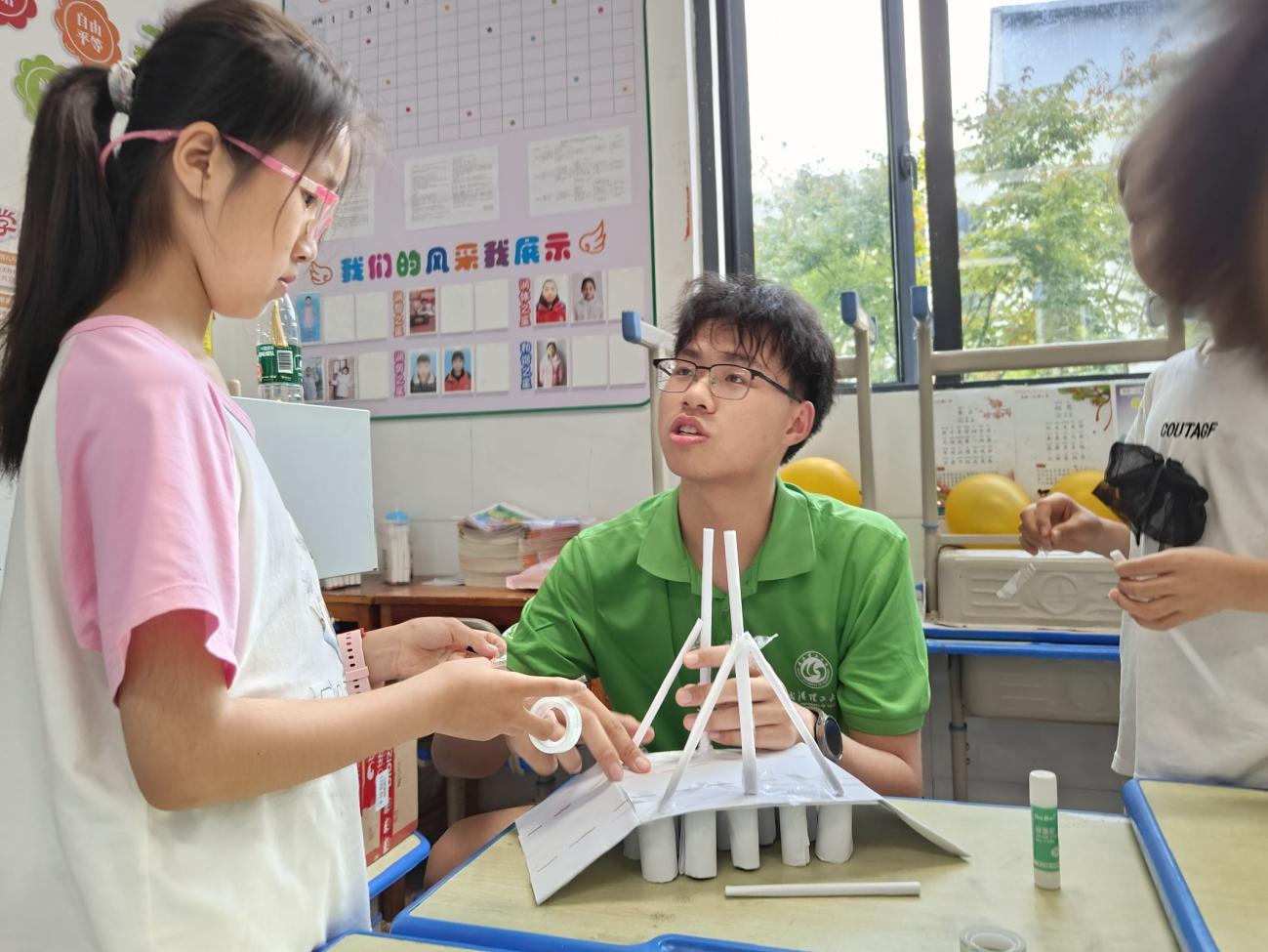 图为实践队员为孩子讲解纸桥的承重原理