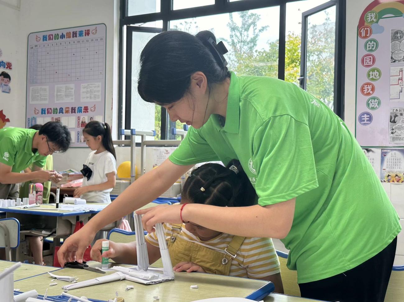 图为实践队员帮助孩子搭建纸桥