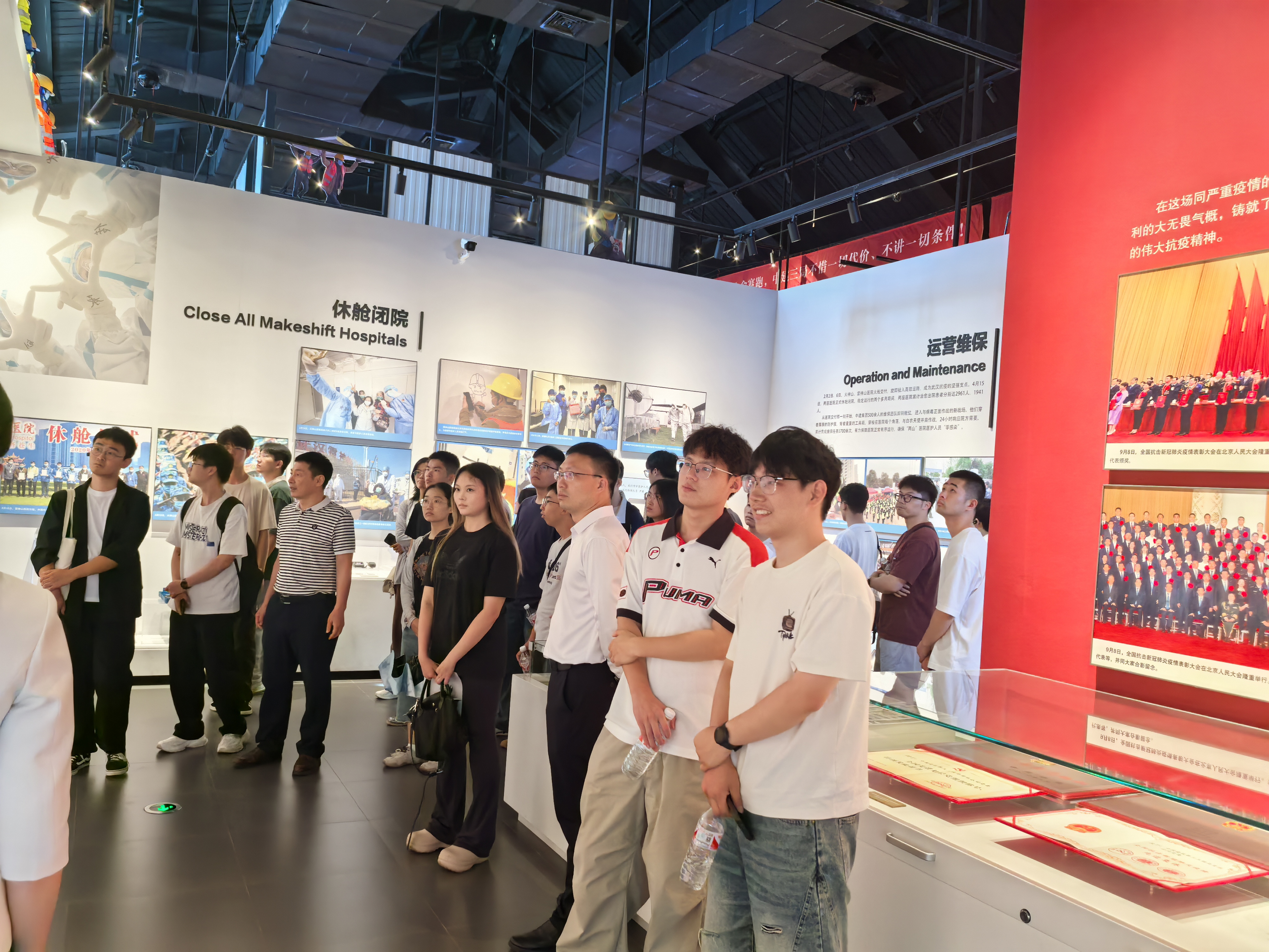 在火神山、雷神山医院建设纪实展部分,一张张按满红手印的请战书、一件件写满祝福语的防护服、一个个沾满泥土的安全帽……都在诉说着武汉这座“英雄城市”曾经的经历,火神山、雷神山医院的建设,充分地彰显了中国速度和中国力量,有力地践行了习近平总书记以人民为中心的发展思想,有力地彰显了中国共产党领导和社会主义制度的政治优势,有力地弘扬了“守望相助、同舟共济”的伟大民族精神。