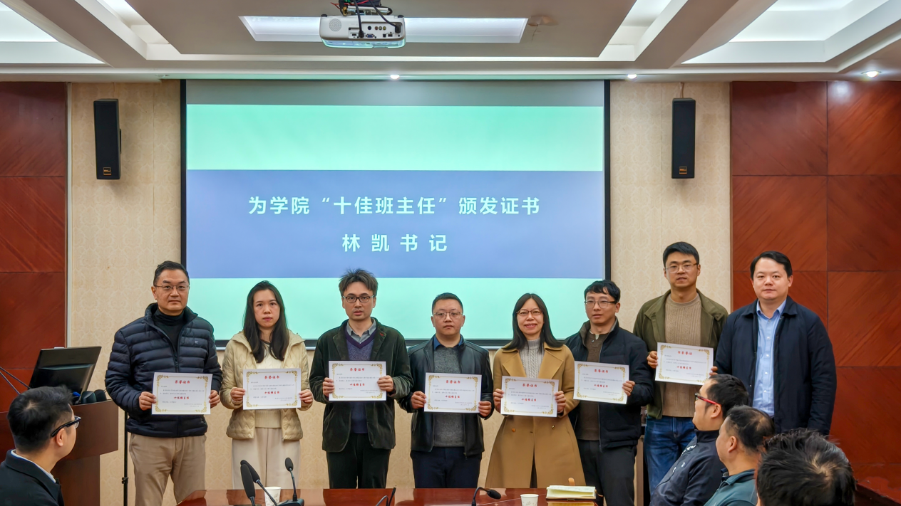 学院党委副书记张巍宣读了“十佳班主任”表彰文件,党委书记林凯为获奖教师颁发证书。校优秀班主任蔡礼雄老师结合自身带班经验,从职责认知、工作方法、学生心理引导等方面作了分享。他指出,班主任应注重学生方向感、心理韧性和综合能力的培养,加强与学工部门的协同,共同筑牢育人阵地。