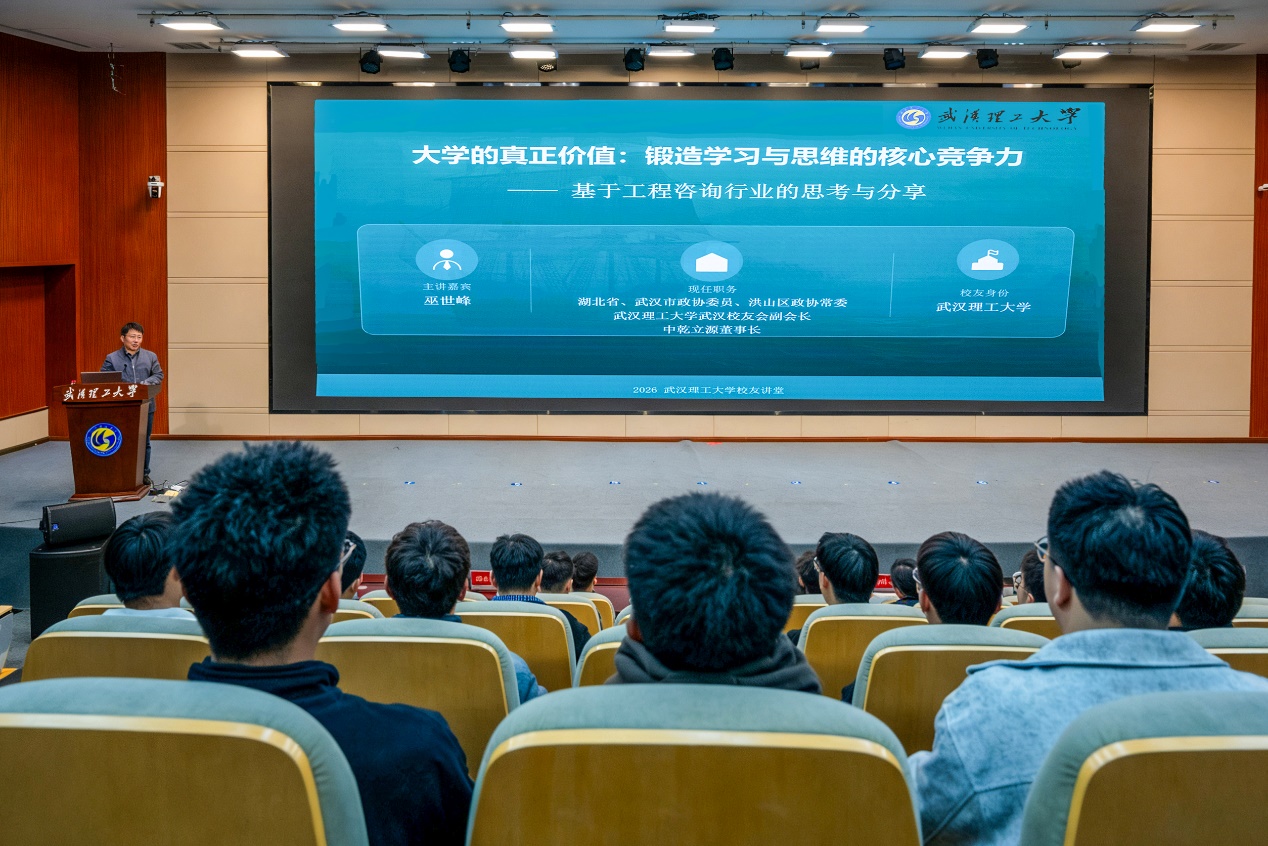 3月26日,中乾立源工程咨询有限公司董事长、湖北省政协委员巫世峰受邀来校,为成人影视片 2025级本科生作“大学的真正价值:锻造学习与思维的核心竞争力”专题报告。中乾立源总裁梁富运、总经理夏丽波、办公室主任闵芳,成人影视片 副院长陈伟、党委副书记张巍,及200名2025级本科生参加报告会。报告会由成人影视片 副院长彭恺主持。